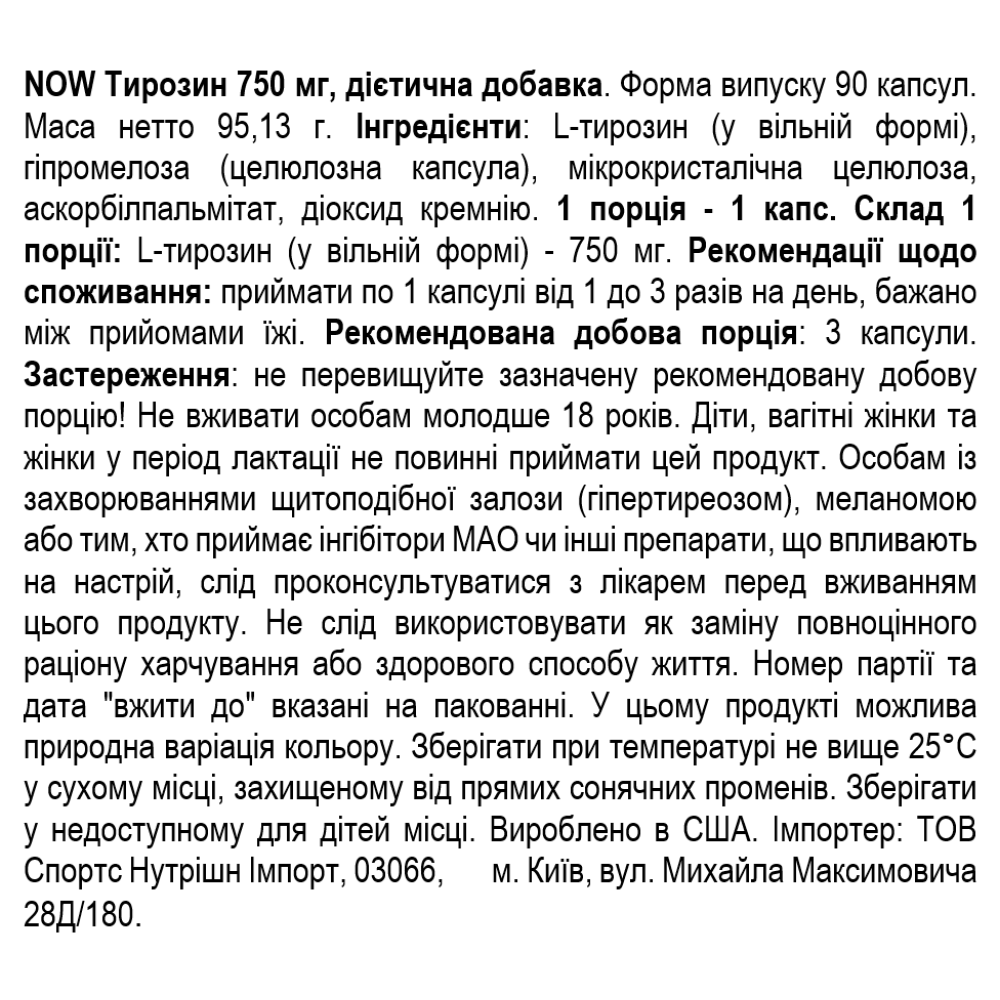 Склад NOW Foods L-Tyrosine 750 мг - 90 капс
