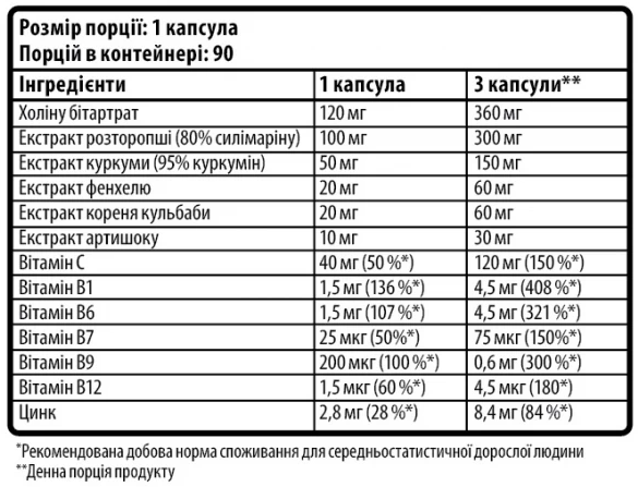 Інгредiєнти: холіну бітартрат, екстракт розторопші (80% силімаріну), екстракт куркуми (95% куркумін), екстракт фенхелю, екстракт артишоку, аскорбінова кислота, біотин, тіаміну гідрохлорид, піридоксину гідрохлорид, фолієва кислота, ціанокобаламін, цинку бісгліцинат.