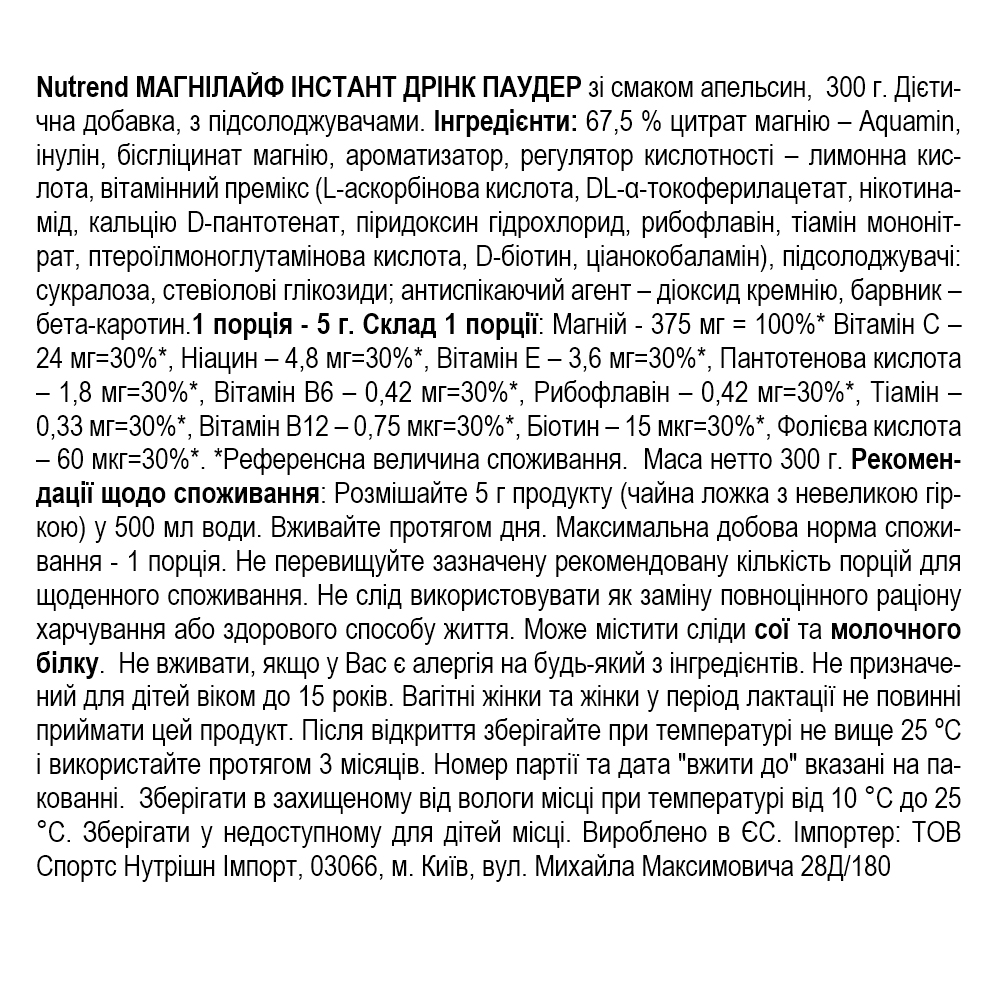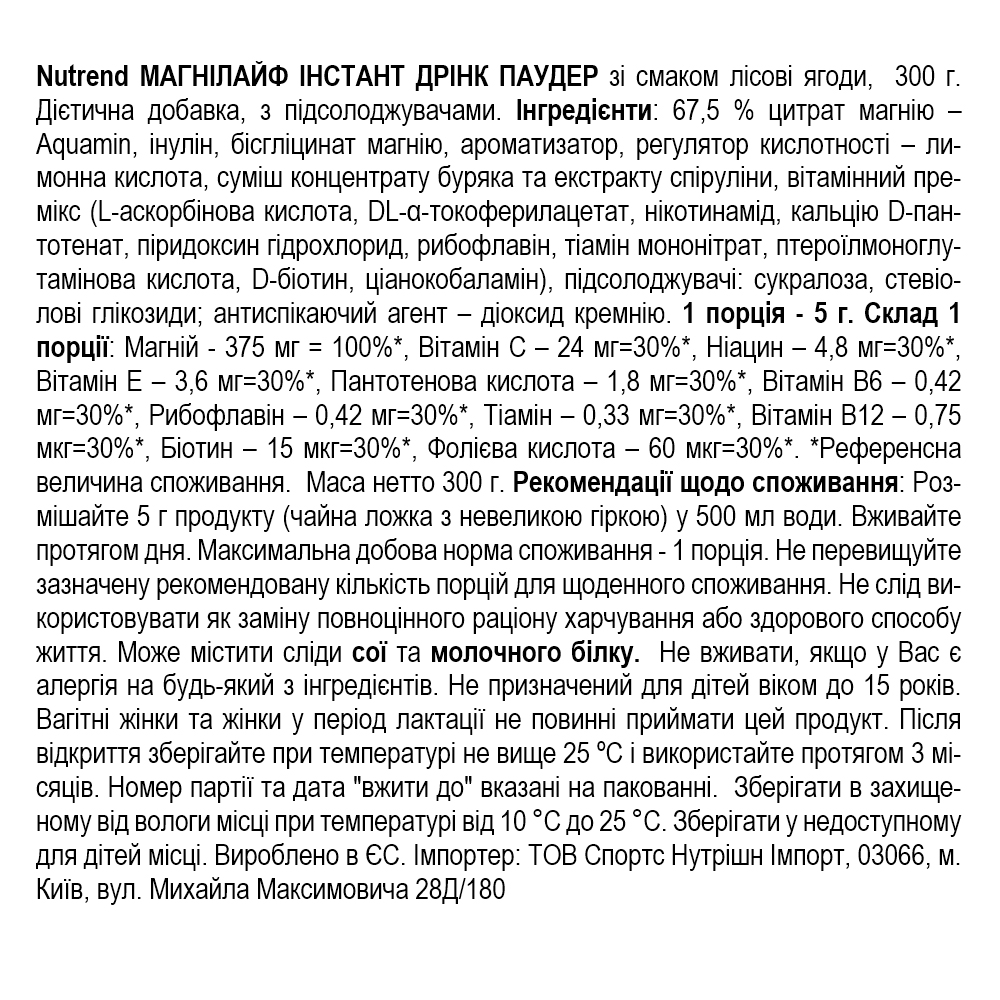 Склад Nutrend MagnesLife Instant Drink