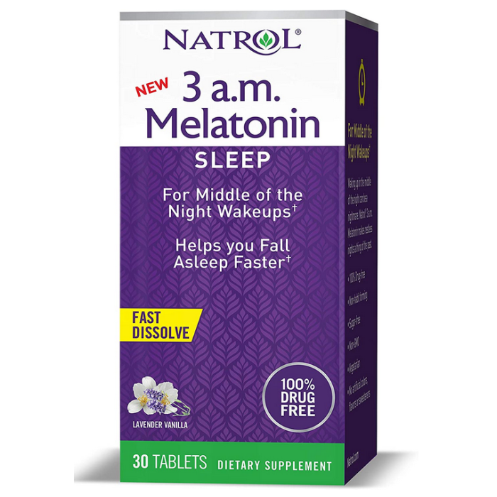 NATROL Melatonin 3 am - 30 таб це швидкорозчинні таблетки, що не вимагають запивання водою, які призначені для людей, які мають проблеми з так званими стадіями сну, тобто для тих хто прокидається вночі і іноді складно потім засинає. Крім того, ці таблетки допоможуть Вам заснути швидше і зняти стрес за день. Це ванільні таблетки з лавандовим ароматом. Пігулки самі розчиняються мовою і вимагають запивання водою.