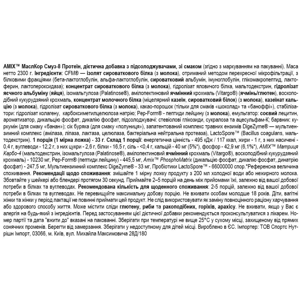 Інгредієнти: CFM ® - ізолят сироваткового білка, отриманий методом мікрофільтрації з перехресним потоком /з молока/ з білковими фракціями (бета-лактоглобулін, альфа-лактоглобулін, сироватковий альбумін, імуноглобулін, глікомакропептид, лактоферин, лактопероксидаза); концентрат сироваткового білка /з молока/, гідролізат яловичого білка, мальтодекстрин, гідролізований яєчний альбумін, ізомальтулоза Palatinose ® , амілопектиновий ячмінний крохмаль Vitargo ® , воскоподібний кукурудзяний крохмаль, концентрат молочного білка (міцелярний казеїн , сироватковий білок), казеїнат кальцію /з молока/, гідролізат сироваткового білка /з молока/ , какао-порошок (тільки у смаках шоколад та баноффі), стабілізатори: гідролізат колагену, карбоксиметилцелюлоза натрію; Pep-Form ® - лейцинові пептиди /з молока/, емульгатор: соєвий лецитин, ароматизатор, дикальційфосфат, калійфосфат, підсолоджувачі: стевіолглікозиди, сукралоза та ацесульфам-К; барвник: куркумін (банановий смак); буряковий сік (зі смаком полуниці), запатентований травний фермент DigeZyme ® - мультиферментний комплекс (амілаза, ліпаза, лактаза, целюлаза, бактеріальна нейтральна протеаза), Aminogen ® (мальтодекстрин, суміш протеаз), LactoSpore ® (Bacillus sporogenes, мальтодекстрин).