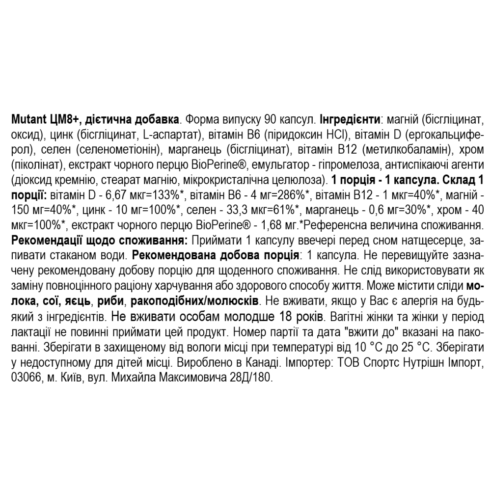 ZM8+ Mutant - це комплекс із трьох інгредієнтів: цинку, магнію та вітаміну B6, які сприяють збільшенню вироблення анаболічного гормону (тестостерону) у спортсменів.