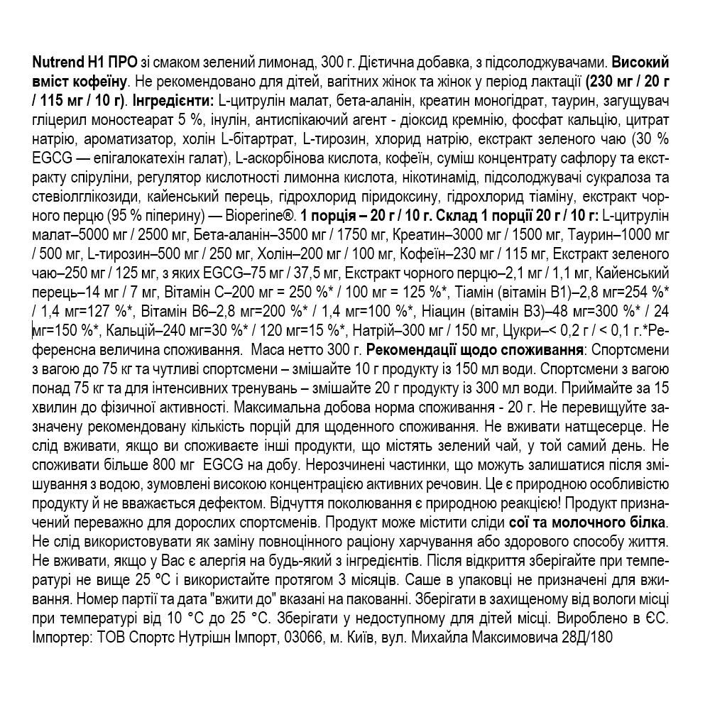 N1 PRO — це продукт із підвищеною концентрацією активних компонентів, створений як професійний передтренувальний комплекс для додаткової підтримки організму перед силовими навантаженнями чи тренуваннями на витривалість. Комбінація кофеїну, таурину, екстракту зеленого чаю та вітамінів групи B традиційно використовується у спортивному харчуванні та може сприяти загальному відчуттю тонусу та зібраності. Для спортсменів, що працюють із силовими навантаженнями, у формулі також присутній креатин.