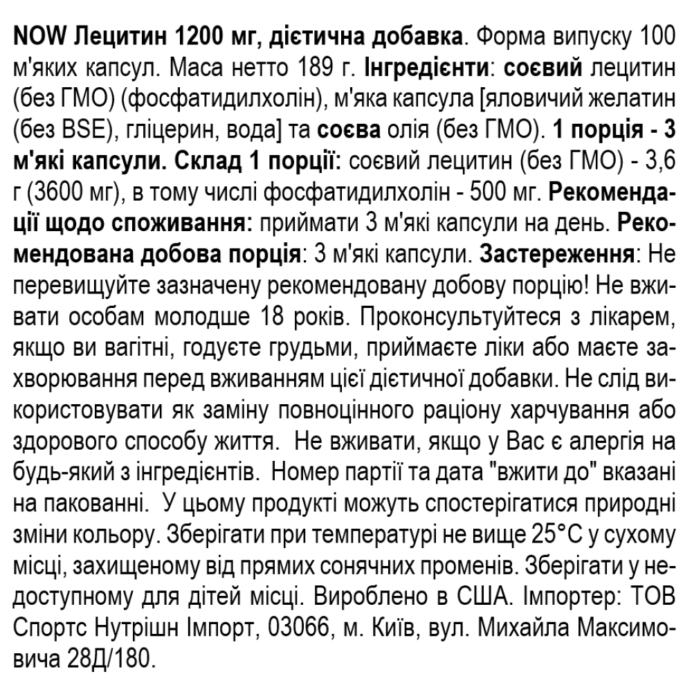 Склад NOW Foods Lecithin 1200 мг - 100 софт гель