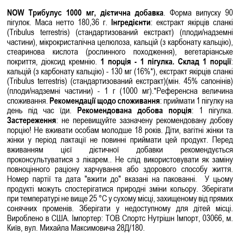 NOW Foods Tribulus 1000 mg – один з найефективніших рослинних препаратів для підвищення рівня тестостерону. Трибулус терестрис (якорці стелиться) повз секрецію тестостерону має ще масу корисних властивостей таких як: нормалізація рівня естрогену і прогестерону, протимікробна та противірусна дія, має жовчогінну та сечогінну дію.