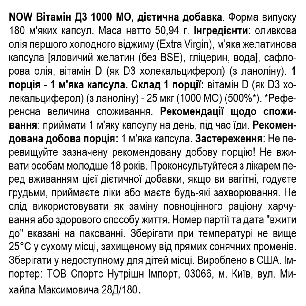 Склад NOW Foods Vitamin D3 1000 ME - 180 софт гель