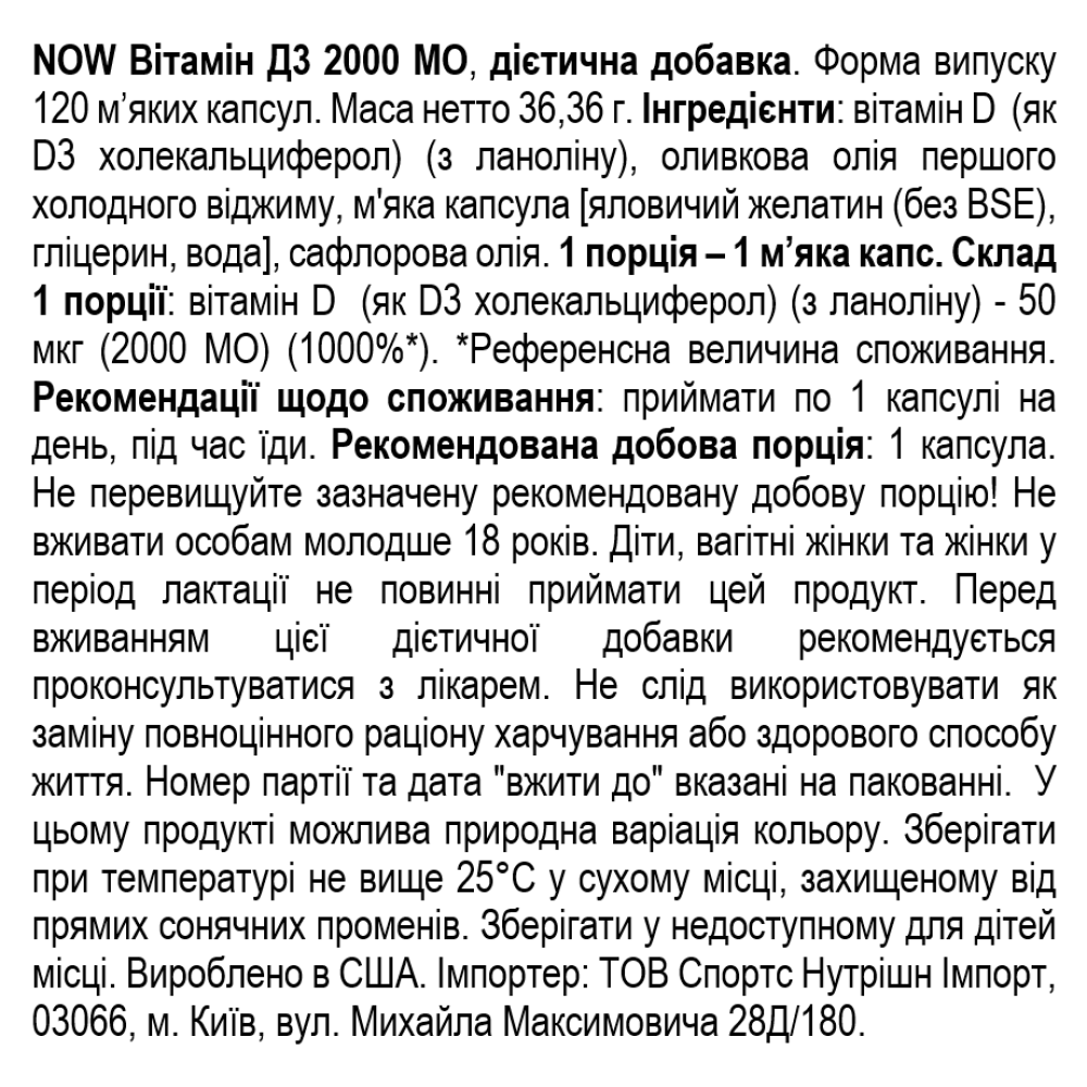 Склад NOW Foods Vitamin D3 2000 ME - 120 софт гель