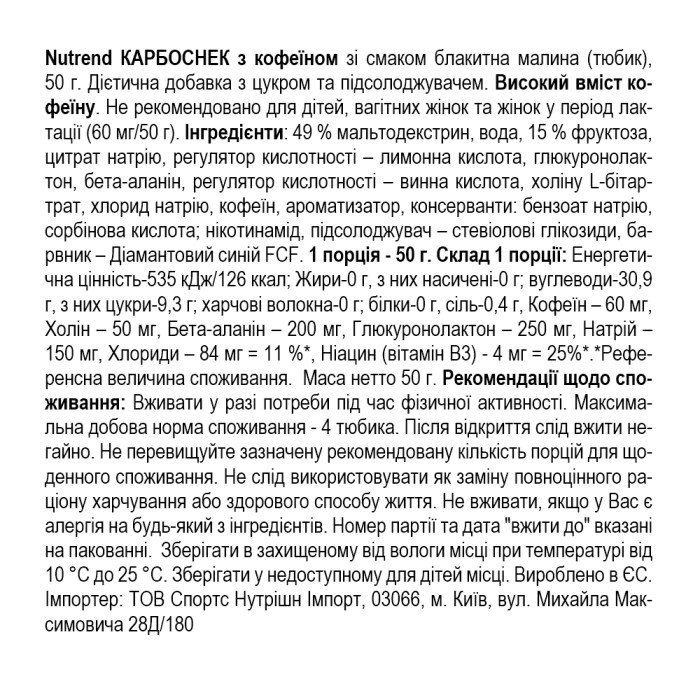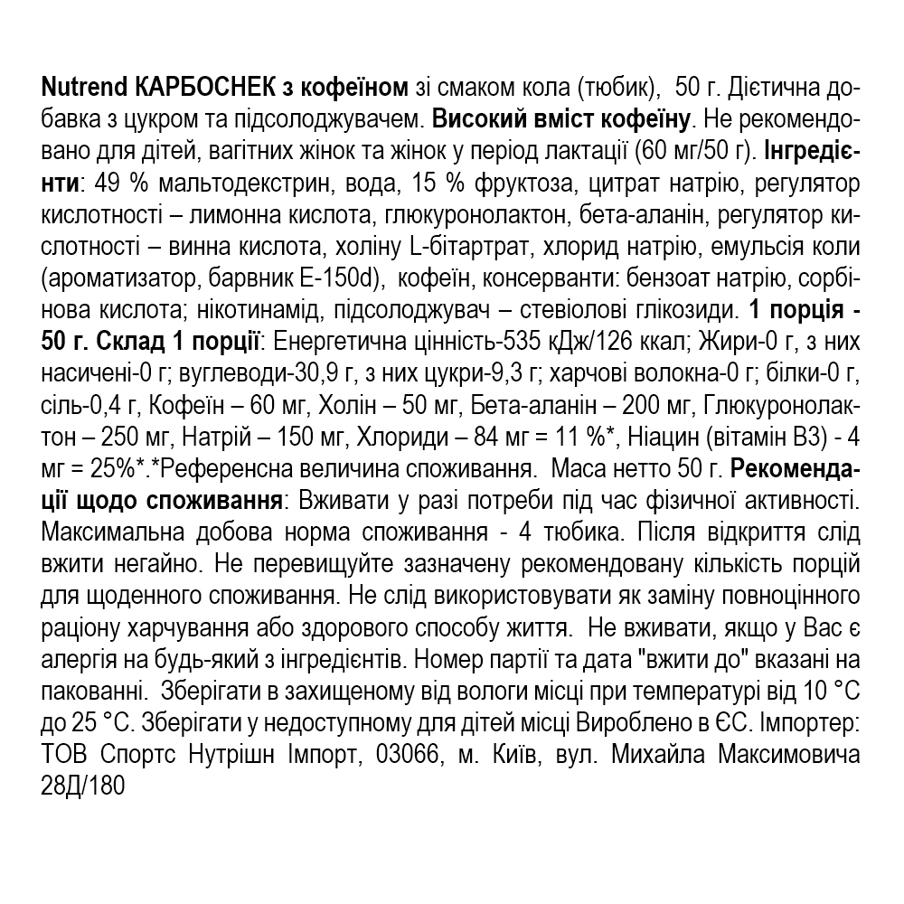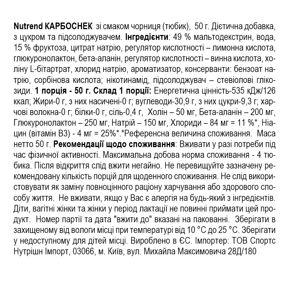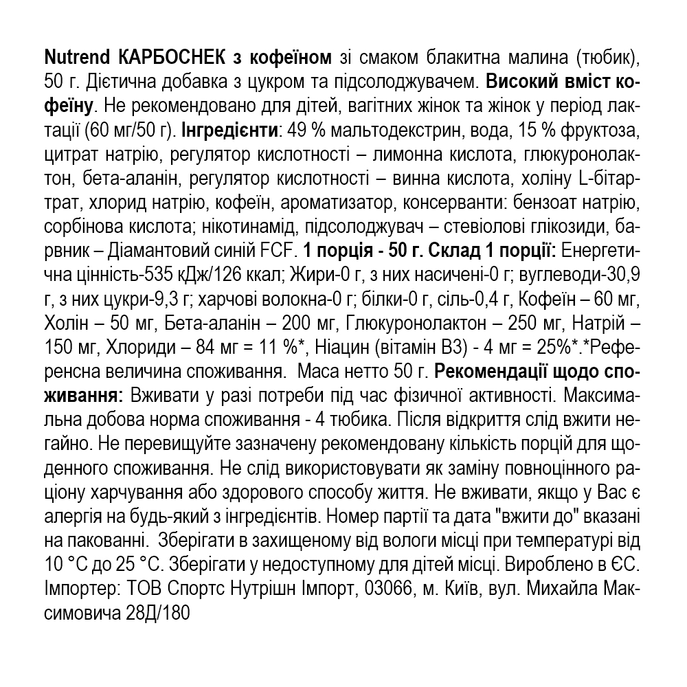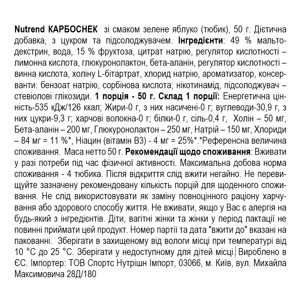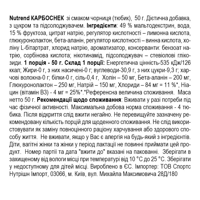 Формула CARBOSNACK поєднує різні типи вуглеводів разом із таурином та гліцином. Таке поєднання зазвичай розглядається спортсменами як варіант для швидкого поповнення енергії. У складі є прості цукри, які часто асоціюють із більш швидким засвоєнням, а також мальтодекстрин — полісахарид, який зазвичай розглядають як джерело енергії тривалішої дії. Гель має легку для споживання консистенцію та може бути комфортним для шлунково-кишкового тракту.