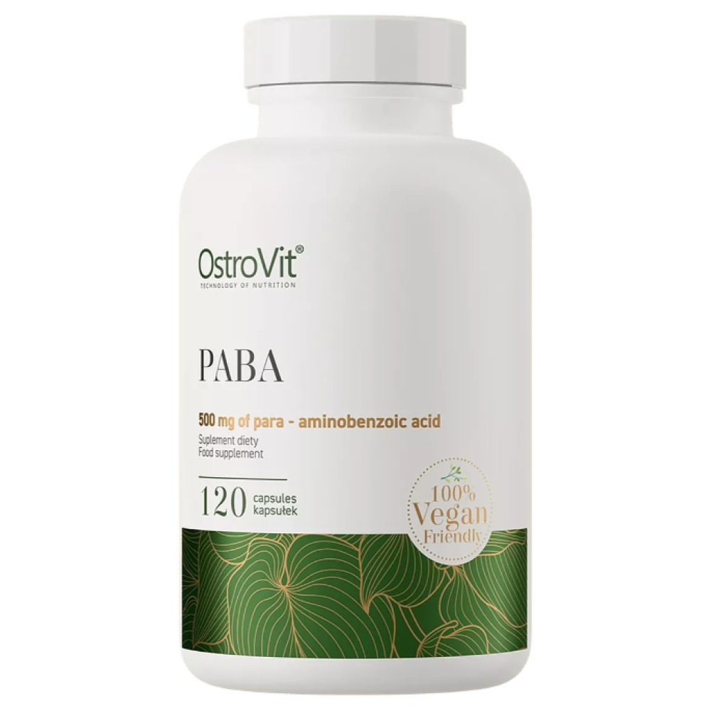 OstroVit PABA VEGE - це дієтична добавка в капсулах, що містить пара-амінобензойну кислоту (ПАБК), також відому як вітамін B10 або вітамін H1. Важливо відзначити, що ПАБК не є істинним вітаміном, так як організм людини може її синтезувати в невеликих кількостях, проте вона бере участь в ряді важливих процесів. Ця добавка від OstroVit підходить для вегетаріанців і веганів.
