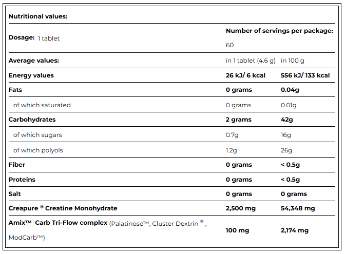 - Забудьте про необхідність розмішувати порошки! Наші жувальні таблетки — це найпростіший і найсмачніший спосіб отримати потрібну порцію креатину.
