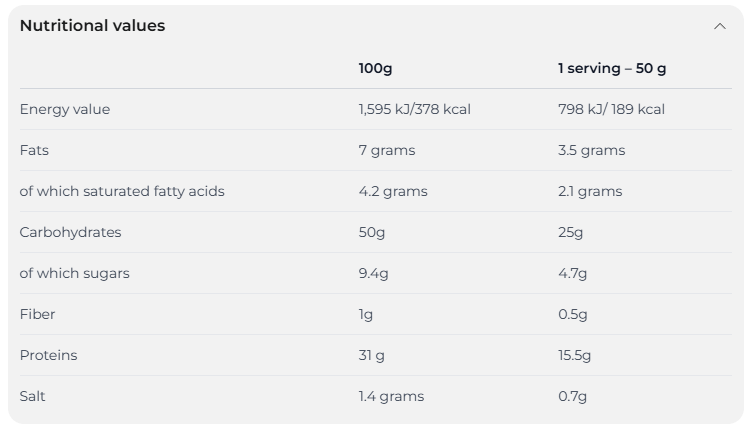 - Високий Вміст Білка: Суміш містить до 31% якісного протеїну (залежно від смаку), який включає молочний протеїновий ізолят (MPI), сироватковий протеїновий концентрат (WPC) та сушений яєчний білок. Це сприяє росту та підтримці м'язової маси.