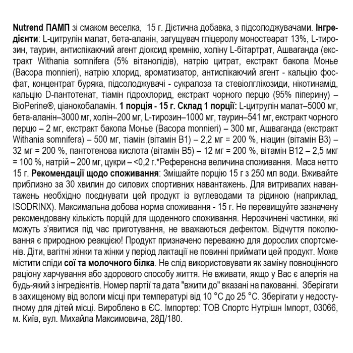 Nutrend PUMP - 15 г - це предтренувальний комплекс, розроблений для спортсменів, які бажають підвищити свою працездатність, витривалість і силові показники під час тренувань.