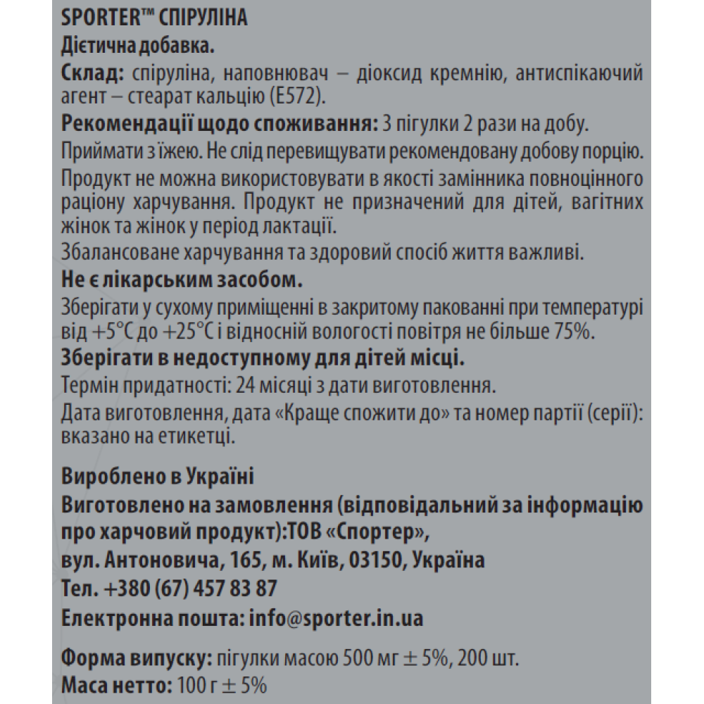 Sporter Spirulina може використовуватися як частина комплексного підходу до підтримання загального стану організму та різноманітності раціону. Не є лікарським засобом. Рекомендується враховувати індивідуальні особливості та дотримуватися зазначеного дозування.