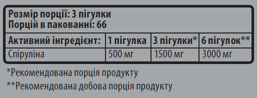 У складі однієї порції (3 таблетки) — 1500 мг спіруліни, що відповідає рекомендованому разовому дозуванню. Добова порція (6 таблеток) забезпечує 3000 мг діючої речовини. Таблетована форма робить продукт зручним для дозування та регулярного застосування.