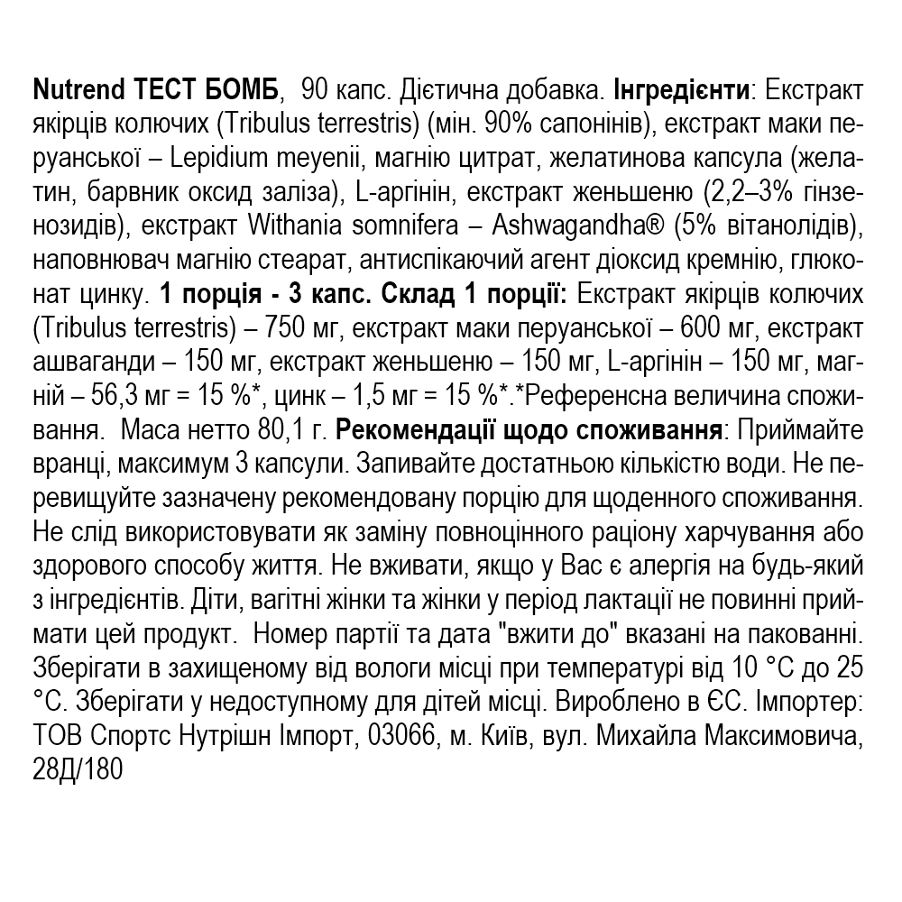 Nutrend Test Bomb - це біологічно активна добавка, створена на основі наукових досліджень і розроблена для задоволення потреб активних чоловіків. Потужна формула, розроблена для чоловіків, які прагнуть підвищити свою фізичну і розумову працездатність. Продукт містить унікальну комбінацію натуральних інгредієнтів, спрямованих на підтримку природного рівня тестостерону і підвищення енергії.