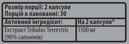Склад: екстракт Tribulus terrestris (якірці сланкі) [90 % сапонінів], оболонка капсули: желатин; барвник: діоксид титану.
