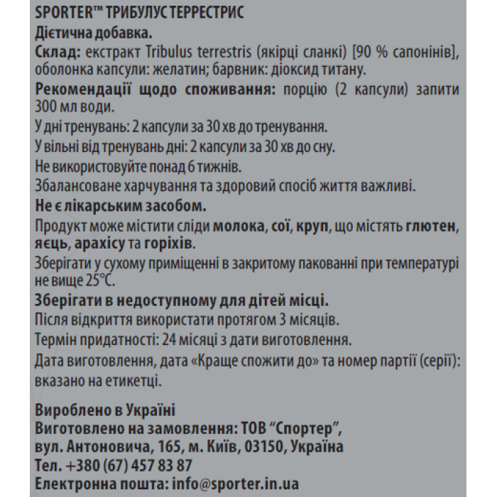 Sporter Tribulus Terrestris — це високоякісна дієтична добавка, розроблена для тих, хто прагне підтримувати активний спосіб життя та загальне гарне самопочуття.