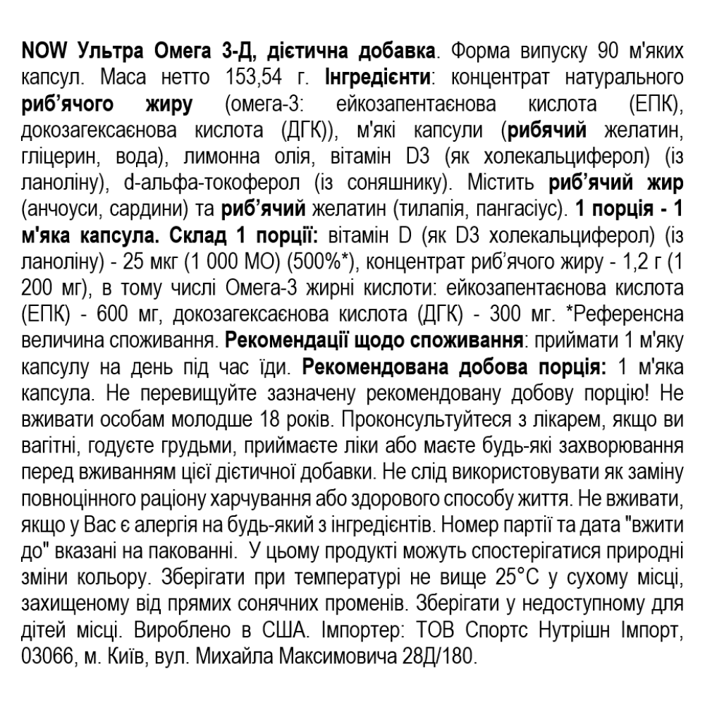 Склад NOW Foods Ultra Omega 3-D - 90 софт гель
