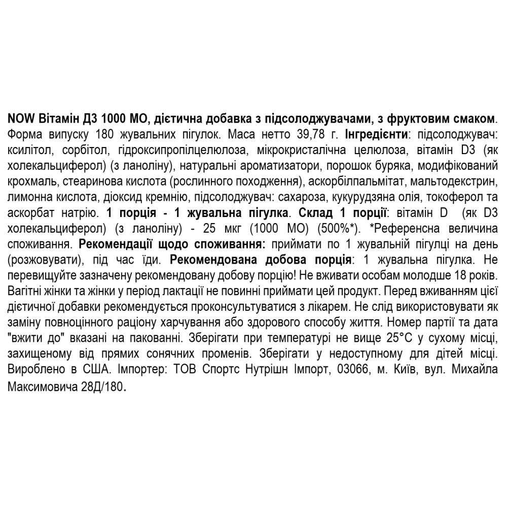 Склад NOW Foods Vitamin D3 1000 ME - 180 жувальних таб - Фруктовий