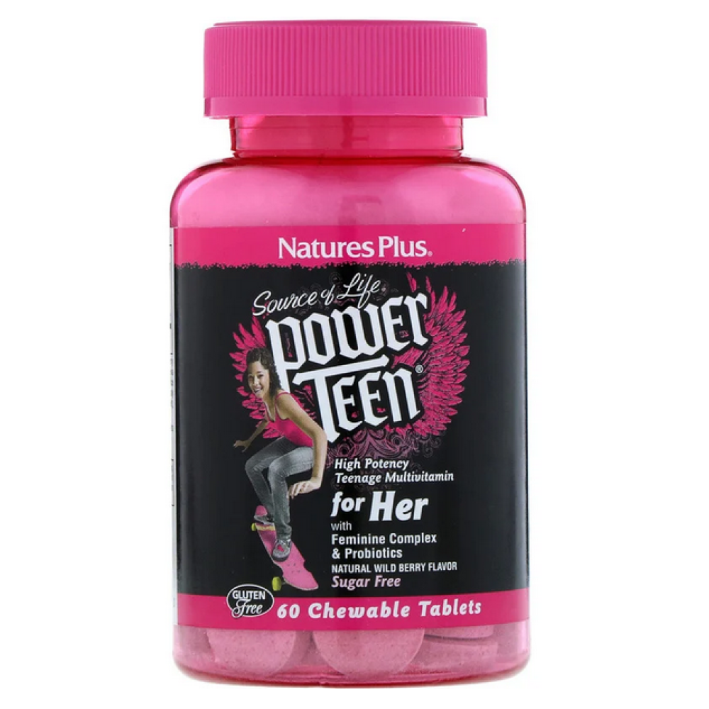 Nature's Plus Power Teen For Her - 60 таб (Sugar Free) жувальні вітамінні цукерки для дівчаток з ягідним смаком без цукру. Це спеціальний вітамінно-мінеральний комплекс з пробіотиками, саме для дівчат-підлітків розрахований на середньостатичну дівчинку з 10 до 13 років, але батьки повинні орієнтуватися на масу тіла дитини, інтенсивність росту та фізичну активність. Таблиці норми ваги і відповідно до норми витрати енергії, деякі діти можуть вступити в цей період раніше. Цей підлітковий період триває до періоду початку статевого дозрівання 15-17 років, але знов-таки вік вступу у кожної дитини в цей період може бути різним, після вступу дитини в період статевого дозрівання потреби в вітамінах і мінералах можуть збільшитися або видозмінитися, але звичайно види Основних життєвоважливих вітамінів і мінералів залишаться такими ж.