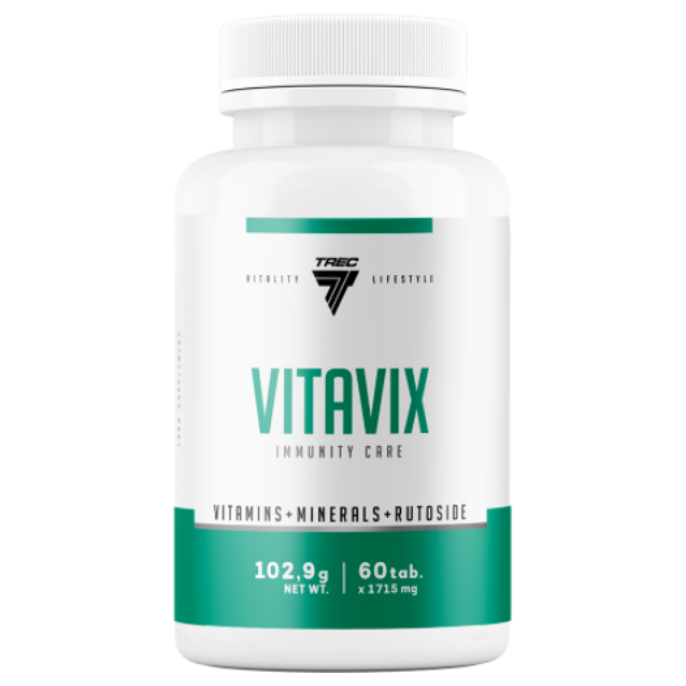 Trec Vitality Vitavix - вітамінно-мінеральна добавка з міцним та надійним складом. Це забезпечує реальне посилення дієти та дозволяє легше збалансувати її щодня. Позитивно впливає на роботу всього організму, включаючи імунну, травну та нервову системи. Препарат знаходиться у формі зручних для ковтання та практичних таблеток. Характеризується хорошою біодоступністю та правильно підібраними дозами окремих мікроелементів (вітамін С, цинк, рутозид, селен та вітамін D). Допомагає в задоволенні потреб організму як просунутих, так і спортсменів-початківців.