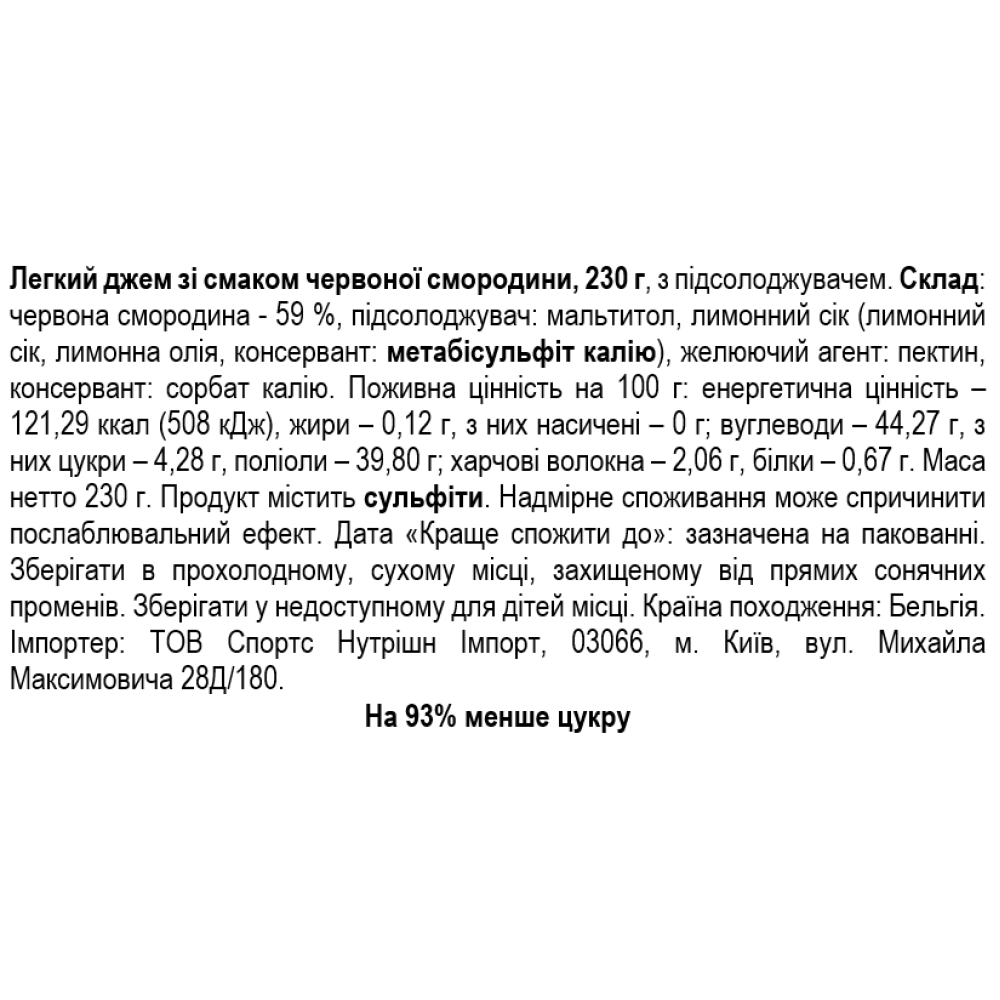 Red Currant — 59%, Sweetener: maltitol, Lemon juice (lemon juice, citric acid), Preservative: potassium metabisulfite, Gelling agent: pectin, Preservative: potassium sorbate