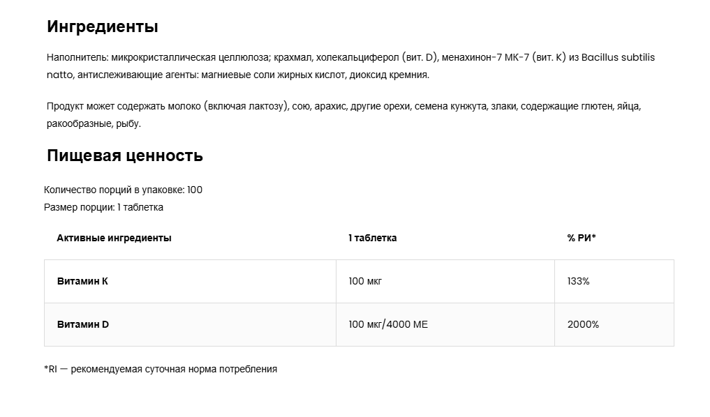 Состав Ostrovit Vitamin D3 4000 + K2 - 100 таб