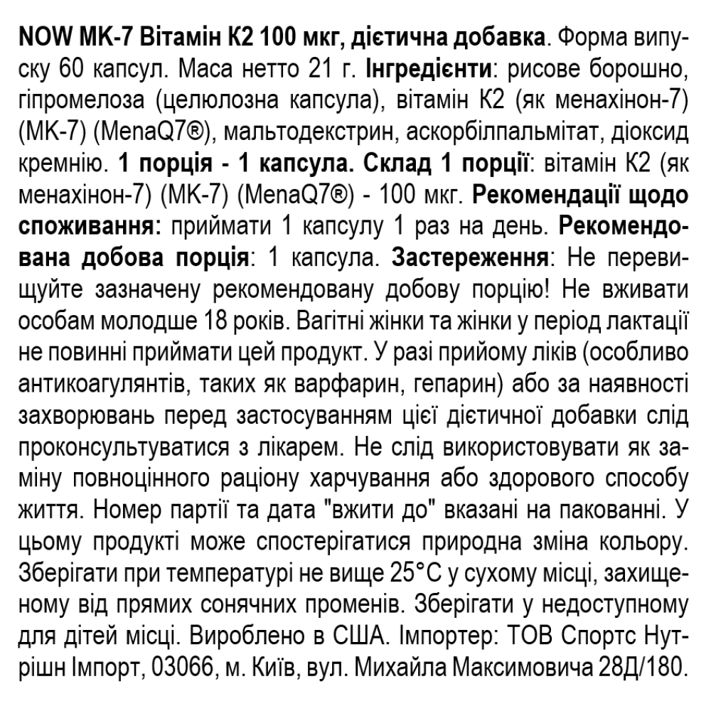 Состав NOW Foods Vitamin K-2 100 мкг - 60 веган капс
